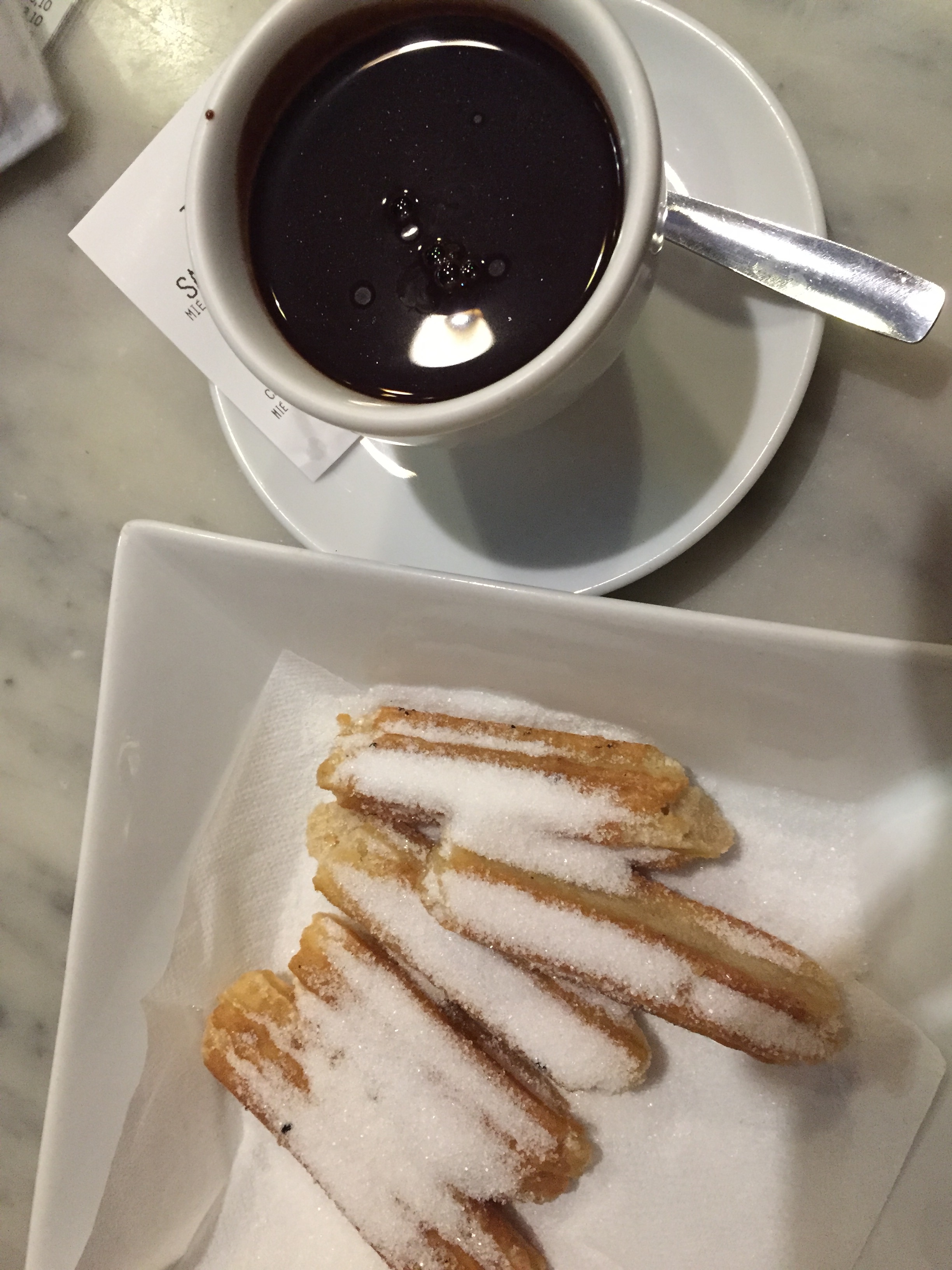 Her menünün olmazsa olmazı da bir tatlı ise biz de kapanışı bütün Barselona’da en iyisini aradığımız ‘churros’ ile yapalım. Bana sorarsanız bizim tulumba tatlımızın şerbetsizi ve bol çikolata sosuna banılmış hali. Üstüne çikolata sosu biraz ağır geldiği için ben sadece şekere batırılmış halini de sevdim. Biz Gothic bölgesindeki La Granja 1872‘yi tercih ettik.